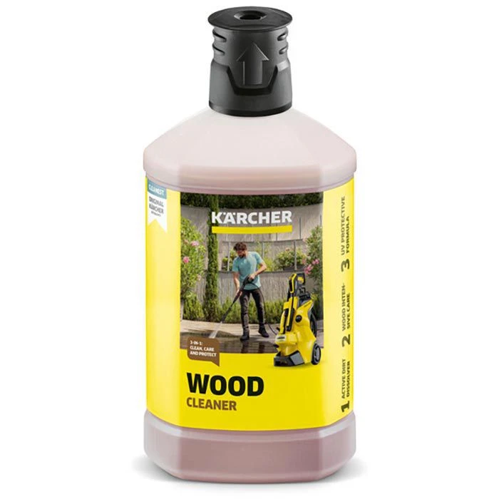 sonstiges: Reinigung und Intensivpflege von empfindlichen, wasserresistenten sowie behandelten und unbehandelten Holzoberflächen (Terrassen, Zäunen, Holzhäuser, etc.), Aktiv-Schmutzlöser für schnelleres und effizienteres Reinigen von Fetten,Grünbelägen und Emissionsverschmutzungen, UV-Schutzformel verzögert das Nachdunkeln von Holz, Plug n Clean-System zur einfachen und schnellen Verwendung für den Hochdruckreiniger