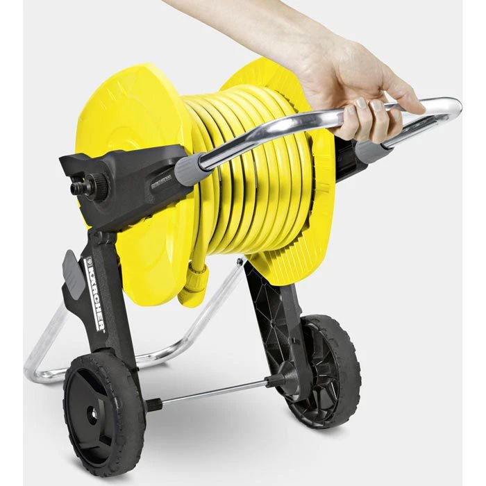 sonstiges: abgewinkelter Schlauchanschluss im Inneren der Trommel gewährleistet einen maximalen Wasserdurchfluss, durch die ergonomische Kurbel lässt sich der Schlauch zuverlässig aufrollen, kein Umfallen mehr durch den ausklappbaren Standfuß, ein Nachtropfstopp sorgt dafür, dass nach dem Gebrauch kein Wasser ausläuft, höhenverstellbare Schubgabel, hohe Standsicherheit des Schlauchwagens, zur platzsparenden Aufbewahrung wird der Standfuß einfach eingeklappt und der Griff nach unten geschoben